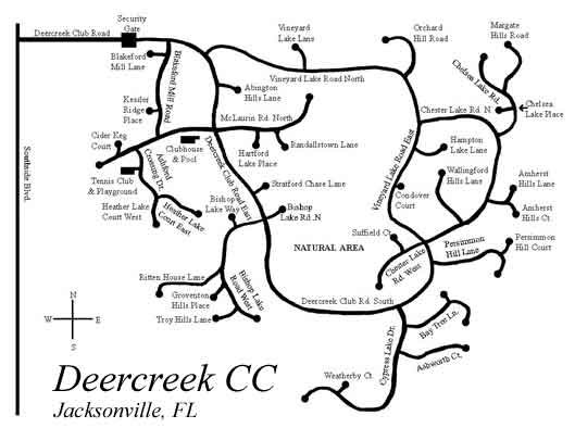Deercreek is located off Southside Blvd., south of Baymeadows Rd. and North of the Avenues Mall near the junction of Southside and Phillips Hwy. (Rt. 1), where I-95 and I-295 meet. To reach the Twnnis Facility, take the main road past the gate, make the second right on to McLaurin Rd., pass the Clubhouse, turn left on Ashford Crossing Dr., the courts will be on your right.